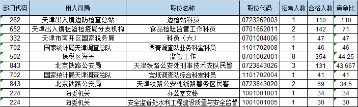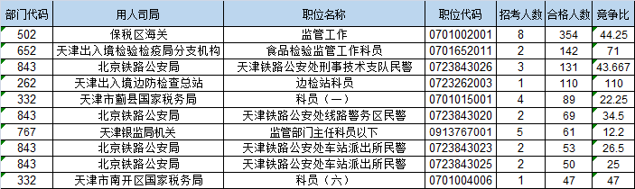 報(bào)名通過審核人數(shù)前十的職位主要集中在保稅區(qū)海關(guān)、天津出入境檢驗(yàn)檢疫局分支機(jī)構(gòu)、北京鐵路公安局,具體信息如下: