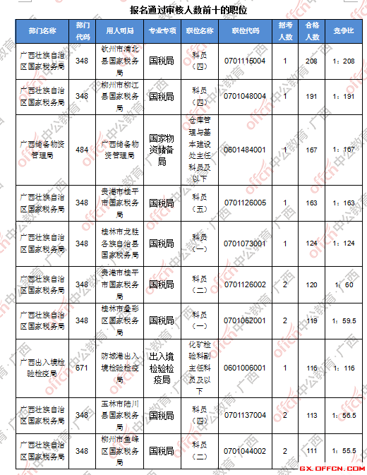 報名通過審核人數前十的職位主要集中在廣西壯族自治區國家稅務局、廣西儲備物資管理局、廣西出入境檢驗檢疫局等部門,具體信息如下: