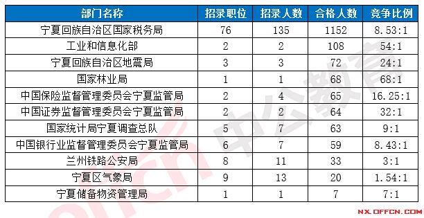 截止到19日8時,寧夏國考合格人數(shù)前三位的部門依次是:寧夏回族自治區(qū)國家稅務(wù)局、工業(yè)和信息化部、寧夏回族自治區(qū)地震局。
