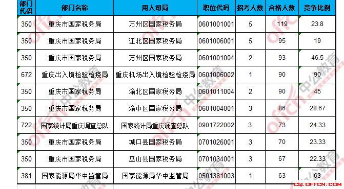 截止到19日8時,競爭比例的職位為‘重慶機場出入境檢驗檢疫局’一職,招錄1人,截止到19日8時通過人數為90人。但是還有少數崗位沒有人去報名。