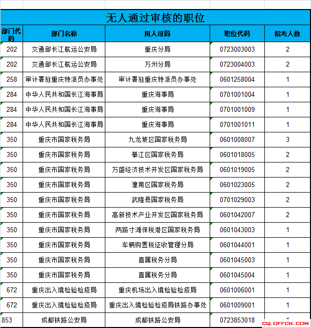 重慶無人報考的職位逐漸在減少,現在重慶的職位暫有19個職位無人報考,占全部職位的6%,無人報考職位如下: