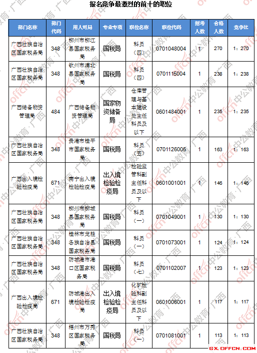 報名通過審核人數前十的職位主要集中在廣西壯族自治區國家稅務局、廣西儲備物資管理局、廣西出入境檢驗檢疫局等部門,具體信息如下: