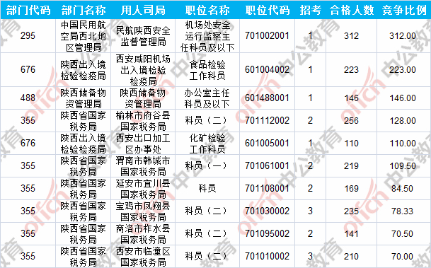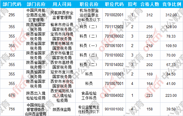 報(bào)名通過審核人數(shù)前十的職位主要集中在陜西出入境檢驗(yàn)檢疫局、陜西省國家稅務(wù)局、中國民用航空局西北地區(qū)管理局等部門,具體信息如下: