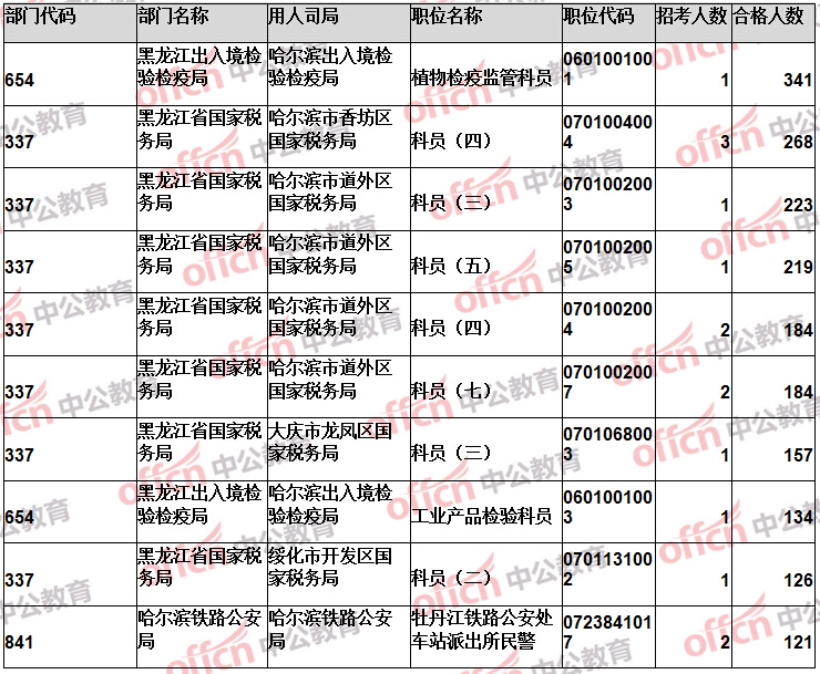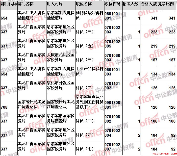 報名通過審核人數前十的職位主要集中在黑龍江省國家稅務局、黑龍江出入境檢驗檢疫局、哈爾濱鐵路公安局等部門,具體信息如下:
