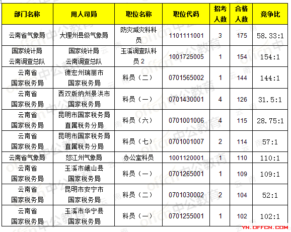 報名通過審核人數前十的職位主要集中在國家統計局云南調查總隊、云南省國家稅務局、云南省氣象局等部門,具體信息如下: