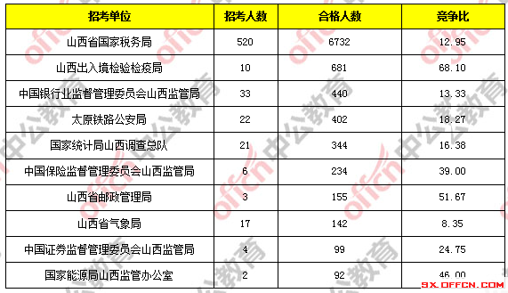 報(bào)考人數(shù)前十的職位主要集中在山西省國(guó)家稅務(wù)局、山西出入境檢驗(yàn)檢疫局這兩個(gè)部門,具體信息如下: