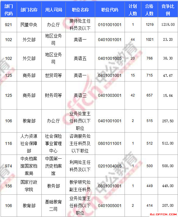 合格人數(shù)前十的職位主要集中在外交部、民盟中央、商務部等部門,具體信息如下: