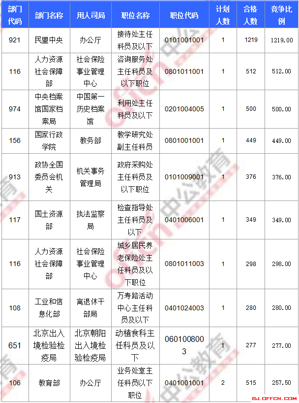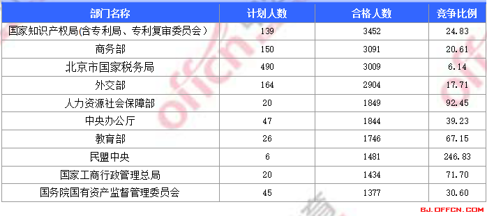 為幫助廣大考生更清晰的了解今日報名情況,北京中公網(wǎng)校整理了合格人數(shù)前十位的部門以及競爭比例最激烈的十大部門,供廣大考生參考: