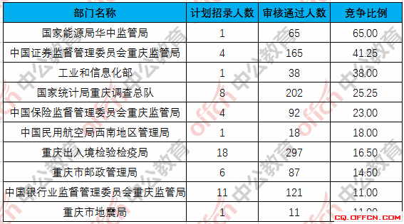 為幫助廣大考生更清晰的了解今日報(bào)名情況,重慶中公網(wǎng)校整理了合格人數(shù)前十位的部門以及競爭比例最激烈的十大部門,供廣大考生參考: