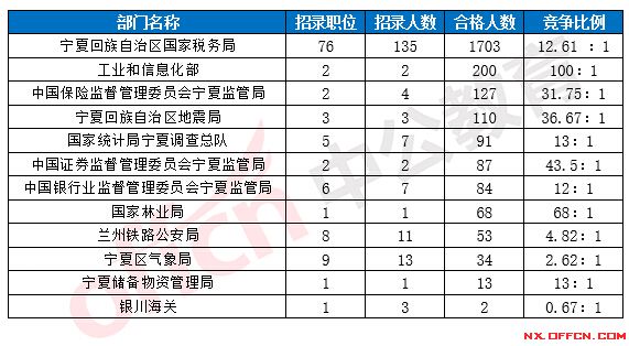 截止到20日8時,寧夏國考合格人數前三位的部門依次是:寧夏回族自治區國家稅務局、工業和信息化部、中國保險監督管理委員會寧夏監管局。
