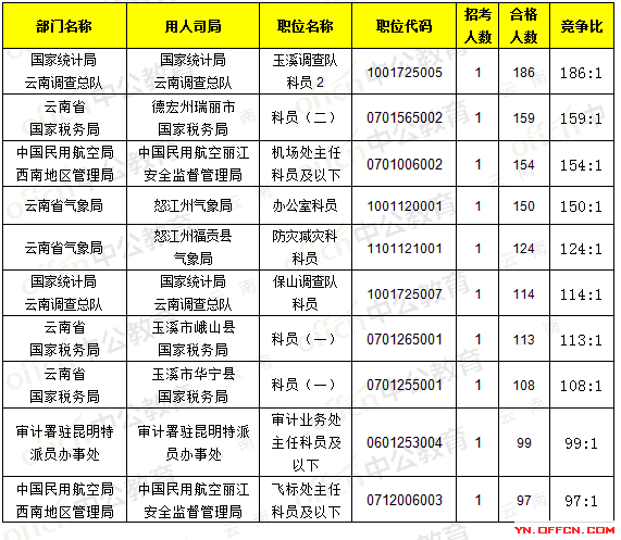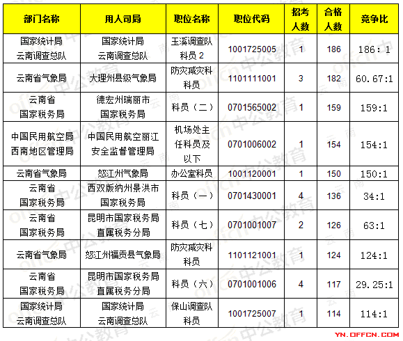 截止20日8時,招錄比例的職位為國家統計局云南調查總隊,職位代碼是1001725005,招錄7人,通過人數404人,競爭比186:1