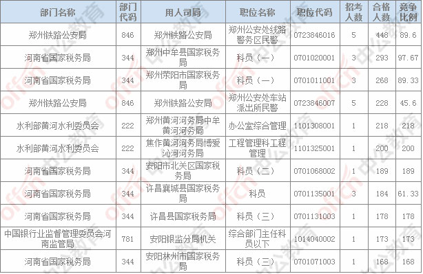 報名通過審核人數(shù)排名前列的職位主要集中在鄭州鐵路公安局、河南省國家稅務(wù)局,水利部黃河水利委員會,具體信息如下: