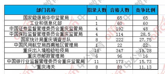 為幫助廣大考生更清晰的了解今日報名情況,重慶中公網校整理了審核通過人數前十位的部門以及競爭比例最激烈的十大部門,供廣大考生參考: