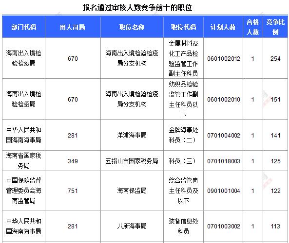 截止到20日16時,仍有17個職位無人報名,而熱門職位競爭卻是越來越激烈,其中報名人數最多的職位為:海南出入境檢驗檢疫局,金屬材料及化工產品檢驗監管工作副主任科員,共報名254人,競爭比例已高達254:1!