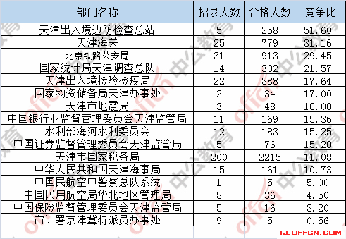 為幫助廣大考生更清晰的了解今日報名情況,天津中公網校整理了審核通過人數前五位的部門以及競爭比例最激烈的五大部門,供廣大考生參考:
