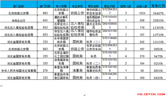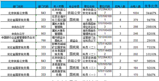 報名通過審核人數(shù)前十的職位主要集中在北京鐵路公安局、河北省國家稅務(wù)局、中央辦公廳等部門,具體信息如下: