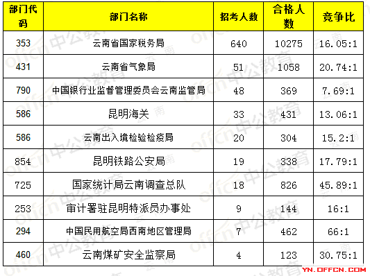 報名通過審核人數前十的職位主要集中在國家統計局云南調查總隊、云南省氣象局、云南省國家稅務局等部門,具體信息如下:
