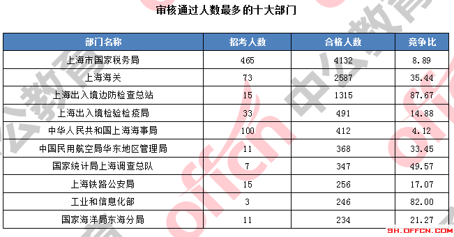 為幫助廣大考生更清晰的了解今日報名情況,上海中公教育整理了審核通過人數前十位的部門以及競爭比例最激烈的十大部門,供廣大考生參考:
