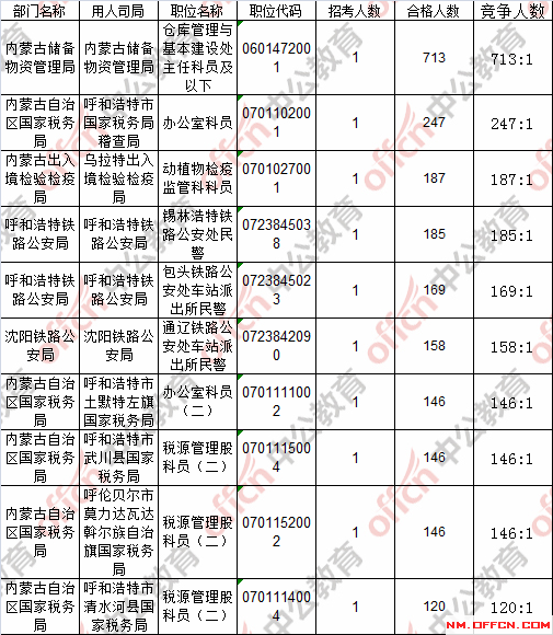 截止到21日8時,競爭比例的職位為內蒙古儲備物資管理局倉庫管理與基本建設處主任科員及以下一職,招錄1人,截止到21日8時通過人數為713人,競爭比例達到713:1!