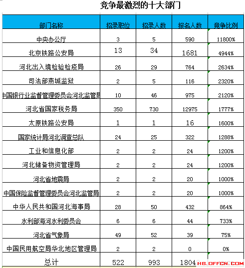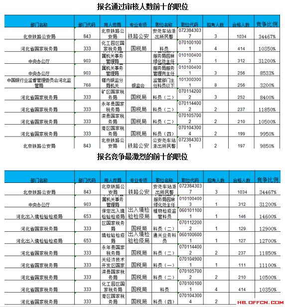 報(bào)名通過審核人數(shù)前十的職位主要集中在北京鐵路公安局、河北省國家稅務(wù)局、中央辦公廳等部門,具體信息如下: