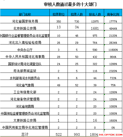 截止到21日8時(shí),通過審核人數(shù)前三位的部門依次是:河北省國家稅務(wù)局、北京鐵路公安局、中國銀行業(yè)監(jiān)督管理委員會(huì)河北監(jiān)管局,三部門通過審核總?cè)藬?shù)達(dá)15631人,占通過審核總?cè)藬?shù)的87%。