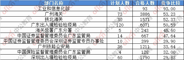 為幫助廣大考生更清晰的了解今日報名情況,廣東中公網校整理了審核通過人數前十位的部門以及競爭比例最激烈的十大部門,供廣大考生參考:
