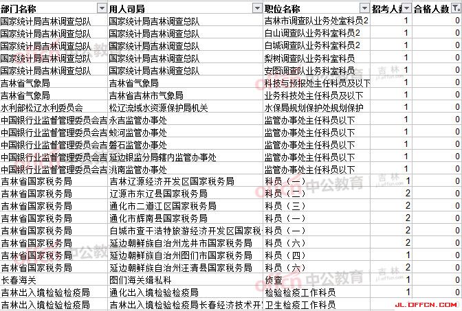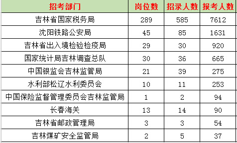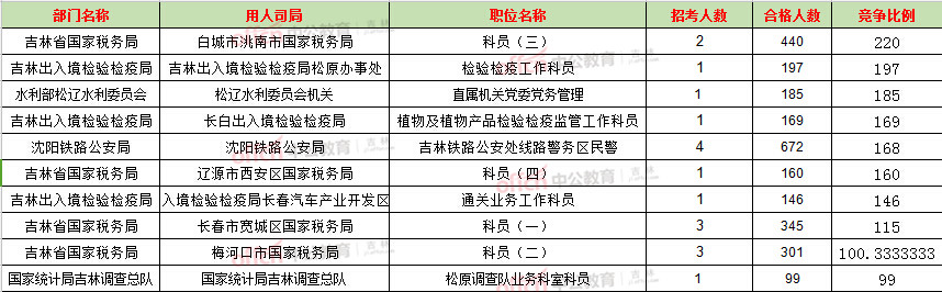 報(bào)名通過(guò)審核人數(shù)前十的職位主要集中在吉林省國(guó)稅局和吉林出入境檢驗(yàn)檢疫局,具體信息如下: