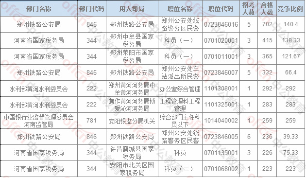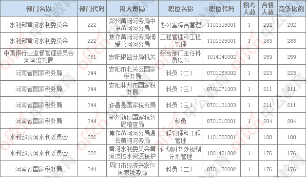 報名通過審核人數(shù)排名前列的職位主要集中在鄭州鐵路公安局、河南省國家稅務(wù)局,水利部黃河水利委員會,具體信息如下: