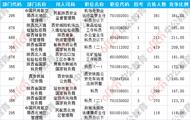 報名通過審核人數前十的職位主要集中在陜西出入境檢驗檢疫局、陜西省國家稅務局、中國民用航空局西北地區管理局等部門,具體信息如下: