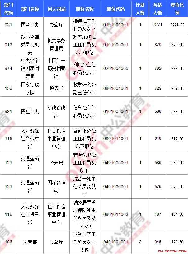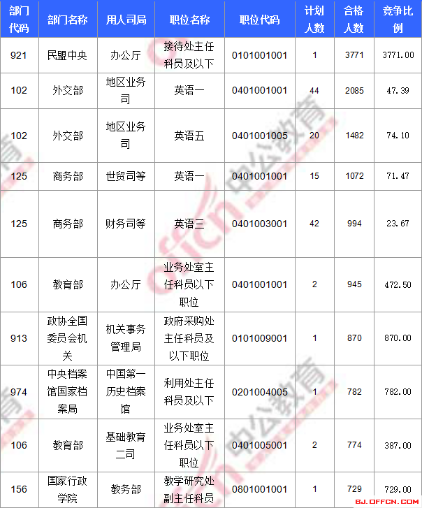 合格人數(shù)前十的職位主要集中在外交部、民盟中央、商務部等部門,具體信息如下: