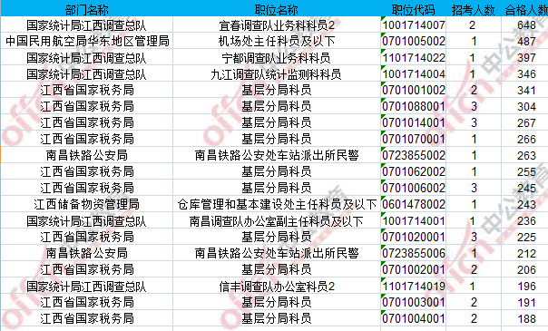 報名通過審核人數前十的職位主要集中在江西省國家稅務局、國家統計局江西調查總隊具體信息如下: