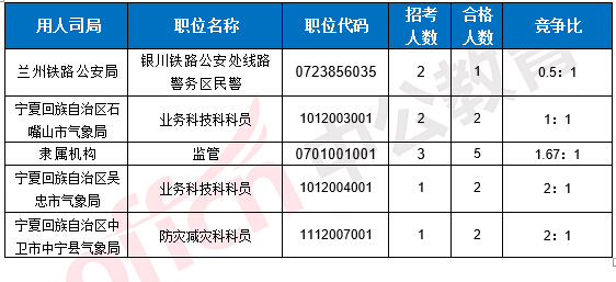 截止到23日8時(shí),工作地點(diǎn)在寧夏的職位均有人報(bào)考,其中5職位競(jìng)爭(zhēng)比低于面試比例。下面是爭(zhēng)比例低于面試比例職位一覽表,中公網(wǎng)校專家建議廣大考生多關(guān)注一些較冷職位,避免激烈競(jìng)爭(zhēng),結(jié)合自身?xiàng)l件,找到屬于自己的職位。