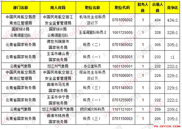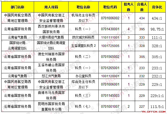 截止23日8時,招錄比例的職位為中國民用航空麗江安全監督管理局_機場處主任科員及以下,職位代碼是0701006002,招錄1人,通過人數434人,競爭比434:1
