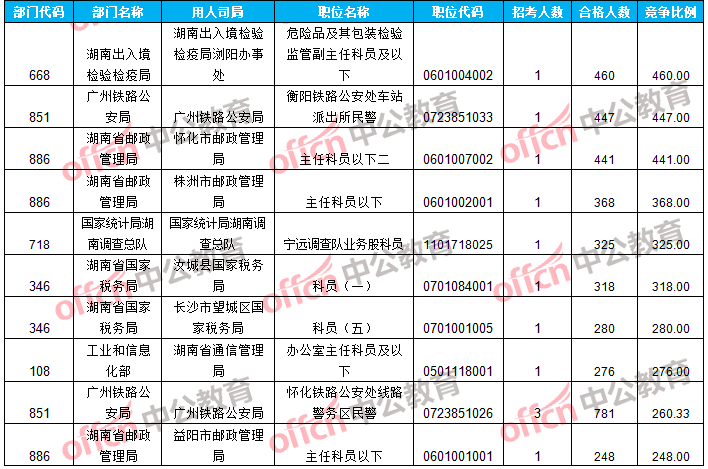 報(bào)名通過審核人數(shù)前十的職位主要集中在廣州鐵路公安局、湖南省郵政管理局等部門,具體信息如下: