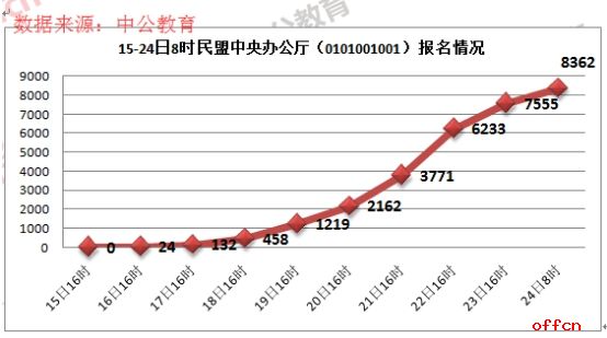 2017國考已進入尾聲,民盟中央辦公廳接待處主任科員及以下(職位代碼為101001001)一職在19日摘得“雙冠”之后,以難以抵擋的“誘惑”,吸引這眾多考生的“蜂擁而至”,穩居“人氣”的“頭把交椅”。截止到24日8時,該職位報名合格人數已增至8362人,報名人數如此之多,令人咂舌,雖然錄取的幾率渺茫,但絲毫擋不住社會人員對此職位的“向往”,中公教育專家預計,在報名最后一天中,此職位報考人數的數值絕不會停滯,而是會“勇往直前”,或可出現“井噴”。