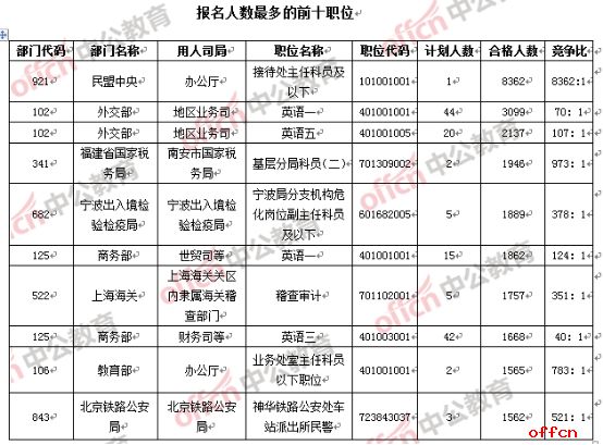 從報考人數上來看,截止24日8時,34個職位已經“破千”,其中,3個職位的報名人數已經2000千,而外交部地區業務司英語一(職位代碼401001001)一職成為今年第二個了3000大關的職位;從競爭比上來說,除民盟中央辦公廳接待處主任科員及以下(職位代碼為101001001)一職位于難以企及的“八千挑一”的高峰之外,另外,還有8個職位是“千里挑一”的職位,這與去年同期相比,前十個職位競爭比都在1107:1之上相較,今年報考“冷熱兩重天”的特點異常顯著,中公教育專家提醒考生,在選擇職位準備“下手”時,一定要保持頭腦清醒,切勿盲目跟風。