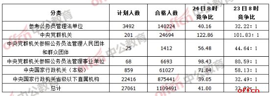 10月24日,2017國家公務(wù)員考試報名進(jìn)入了最后一天,據(jù)中公網(wǎng)校數(shù)據(jù)統(tǒng)計,截至24日8時,經(jīng)過了近9天又1夜的報名后,報名系統(tǒng)已經(jīng)審核通過了1109491人,略高于去年同期的109萬,較昨天下午16時的數(shù)據(jù)相比,報名合格人數(shù)增加了8萬余人,平均競爭比為41:1。民盟中央辦公廳接待處主任科員及以下(101001001)這一職位目前競爭比已經(jīng)高達(dá)8362:1,與其熱度相反的是,截至24日8時,仍有323個崗位報考人數(shù)還未破零,約占2%。中央黨群機(jī)關(guān)參照公務(wù)員法管理人民團(tuán)體和群眾團(tuán)體系統(tǒng)、中央黨群機(jī)關(guān)參照公務(wù)員法管理事業(yè)單位這兩個系統(tǒng)的所有職位已經(jīng)全部有人過審,報考率達(dá)100%。