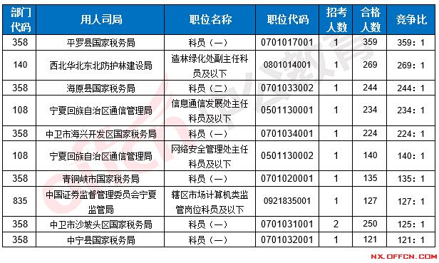 截止到24日8時,競爭比例的職位為平羅縣國家稅務局科員(一)一職,招錄1人,截止到24日8時合格人數為359人。
