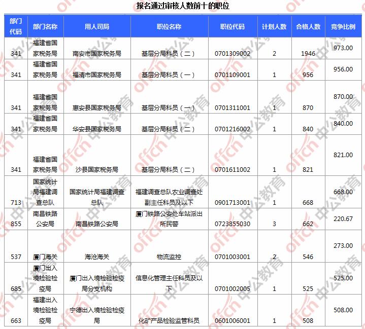 報名通過審核人數前十的職位主要集中在南安市國家稅務局、福清市國家稅務局、惠安縣國家稅務局等部門,具體信息如下: