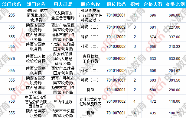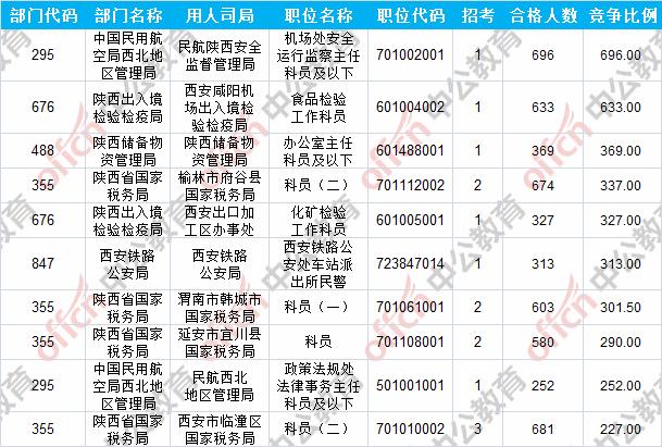 報名通過審核人數前十的職位主要集中在中國民用航空局西北地區管理局、陜西省國家稅務局、陜西出入境檢驗檢疫局等部門,具體信息如下: