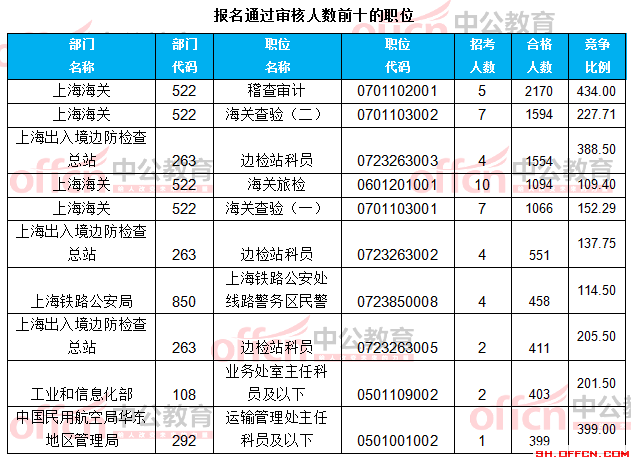 報名通過審核人數前十的職位主要集中在上海海關、上海出入境邊防檢查總站、上海鐵路公安局,具體信息如下: