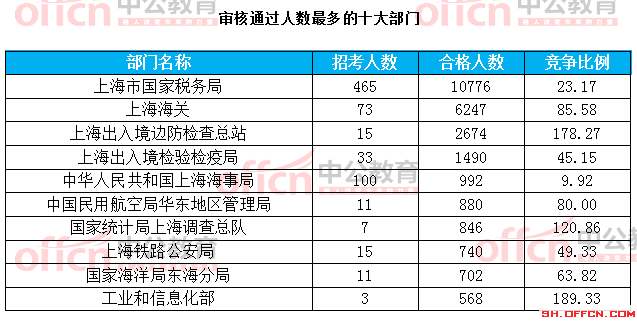 為幫助廣大考生更清晰的了解今日報名情況,上海中公網校整理了審核通過人數前十位的部門以及競爭比例最激烈的十大部門,供廣大考生參考: