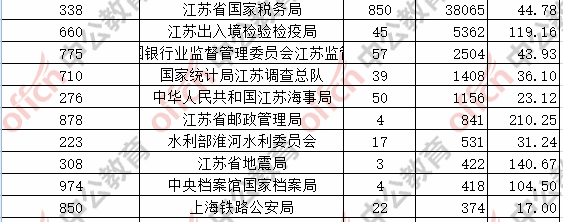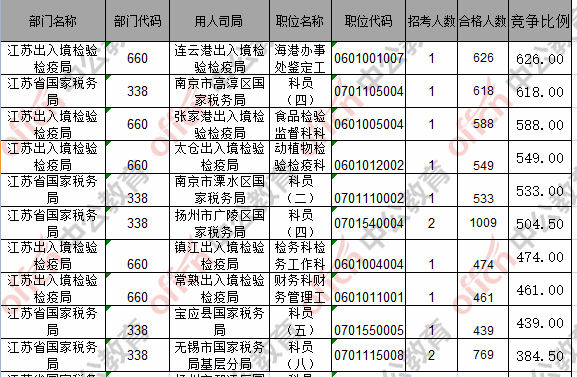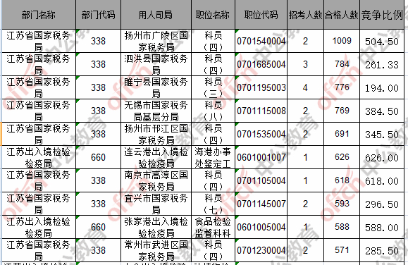 報(bào)名通過(guò)審核人數(shù)前十的職位主要集中在江蘇省國(guó)家稅務(wù)局、江蘇出入境檢驗(yàn)檢疫局,具體信息如下: