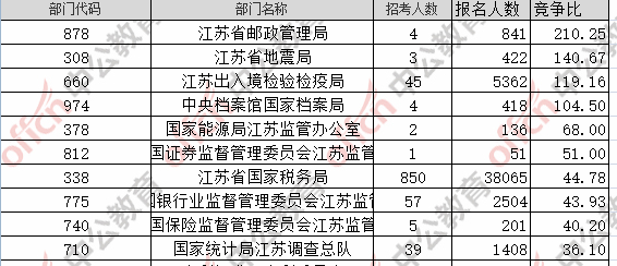 為幫助廣大考生更清晰的了解今日?qǐng)?bào)名情況,江蘇中公網(wǎng)校整理了審核通過(guò)人數(shù)前十位的部門(mén)以及競(jìng)爭(zhēng)比例最激烈的十大部門(mén),供廣大考生參考: