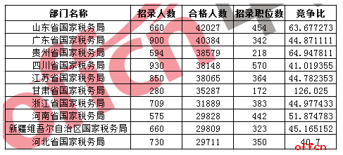 2017國家公務員考試報名階段已于24日18時落下帷幕,截止24日17時30分,共計1338698人通過審核,競爭比49.5:1,仍有223個職位無人報考。從中公網校統計出來的數據可以看到,2017國考報名最多的十大部門全部來自國稅系統,山東國稅局以42027人通過審核位列第一,廣東國稅局、貴州國稅局分別以40384、38579人位列第二、第三位,這十大部門總共報考353727人,占總報名人數的26.4%。