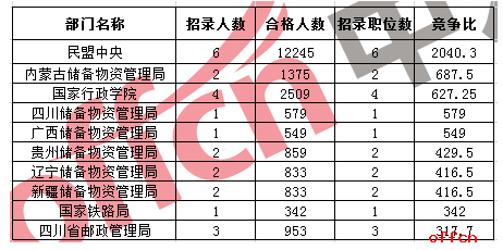 2017國考競爭最激烈部門毫無懸念由民盟中央獲得,該部門僅招錄6人,合格人數已經12245:1,競爭比達2040:1,這也是因為報考職位出自民盟中央,以此拉高了整體競爭比例,除此以外,儲備物資管理局也是考生競爭的部門,競爭最激烈的十大部門中,就有六個來自此系統,競爭比達687.5:1。
