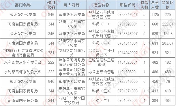 報名通過審核人數排名前列的職位主要集中在鄭州鐵路公安局、河南省國家稅務局,中國銀行業監督管理委員會河南監管局,具體信息如下: