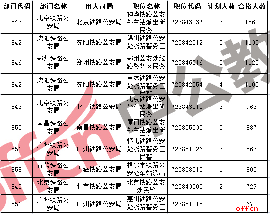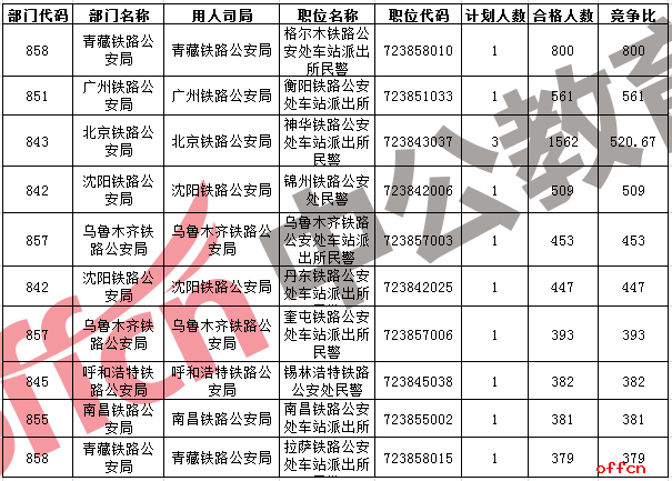 2017國考鐵路公安系統18個部門共提供636個職位,招錄1519人。截至24日17:30,總報名審核通過人數為69581人,競爭比例為45.8:1,仍有4個職位無人報考。下面是中公網校統計的鐵路公安系統報名情況,供考生參考: