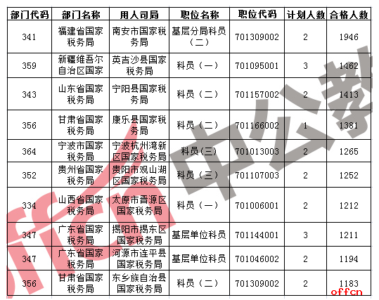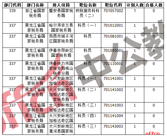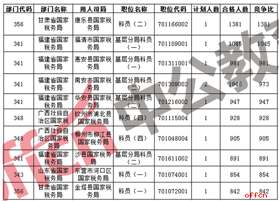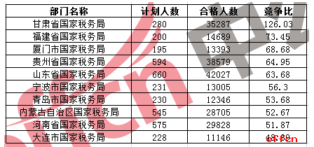 2017國考國稅系統37個部門共提供9455個職位,招錄17476人。截至24日17:30,總報名審核通過人數為756571人,競爭比例為43:1,仍有10個職位無人報考,在這10個職位中有9個來自黑龍江省國稅系統,剩下的一個來自浙江省國家稅務系統。下面是中公網校統計的國稅系統報名情況,供考生參考: