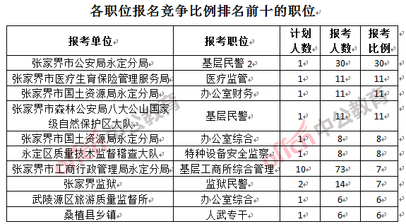 競爭最熱門職位是:張家界市公安局永定分局基層民警2(競爭比例30:1)。